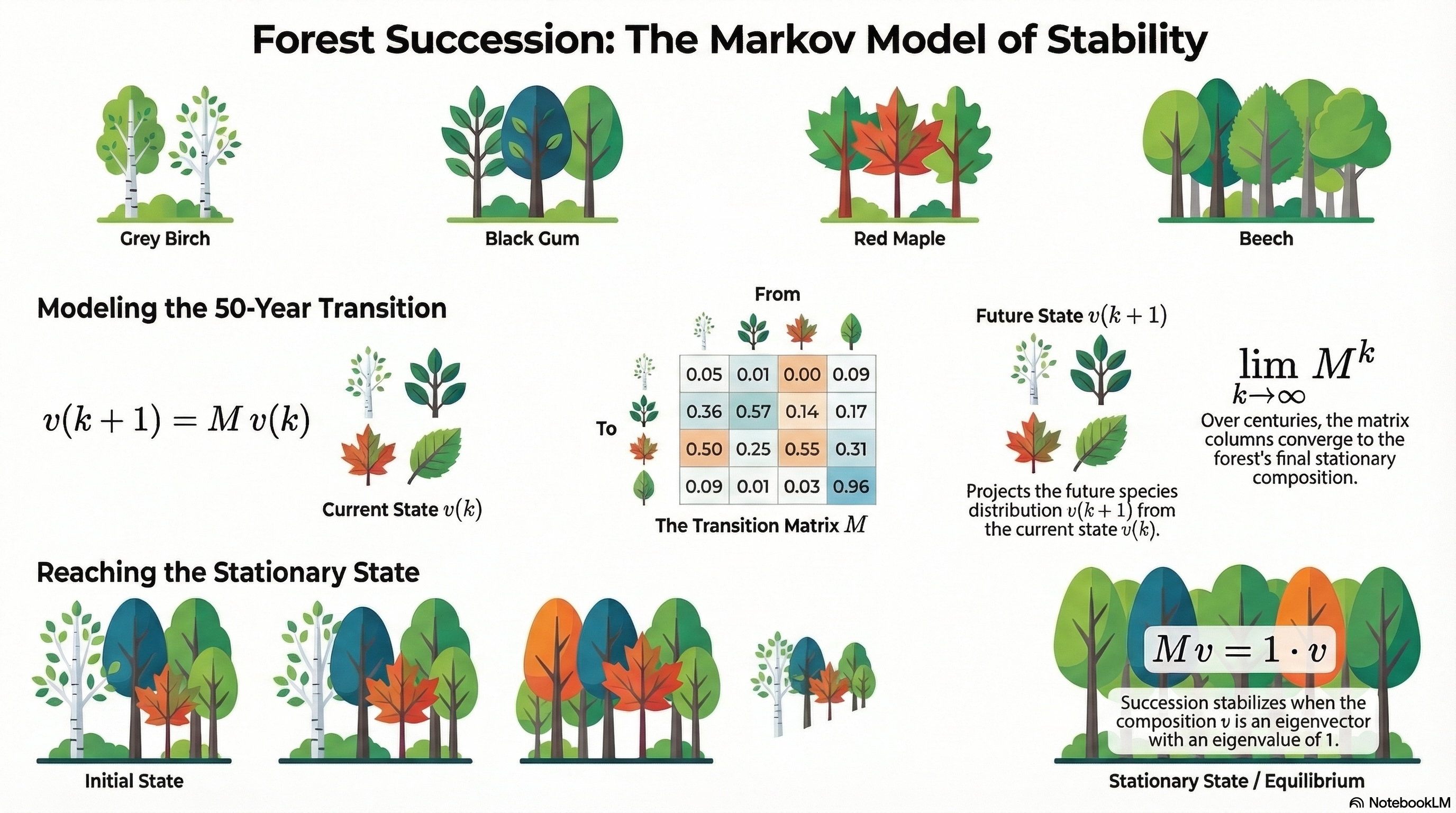 Americký vědec H. S. Horn studoval druhovou skladbu lesa a vycházel z předpokladů, že existuje konstantní pravděpodobnost, že určitý druh je nahrazen jiným druhem. Tabulka pravděpodobností je níže. Pro každý současný druh jsou v řádku pravděpodobnosti, že tento druh bude za 50 let nahrazen druhem ze záhlaví příslušného sloupce. Například pravděpodobnost toho, že na stanovišti, kde nyní roste bříza topololistá poroste za 50 let červený javor je 50% (první řádek, třetí sloupec). Pravděpodobnost toho, že na stanovišti, kde nyní roste javor za 50 let poroste bříza je nulová (třetí řádek, první sloupec). Model předpokládá, že i když se dřevina v lokalitě nevyskytuje, existuje zdroj semen a dřevina se na této lokalitě může objevit.