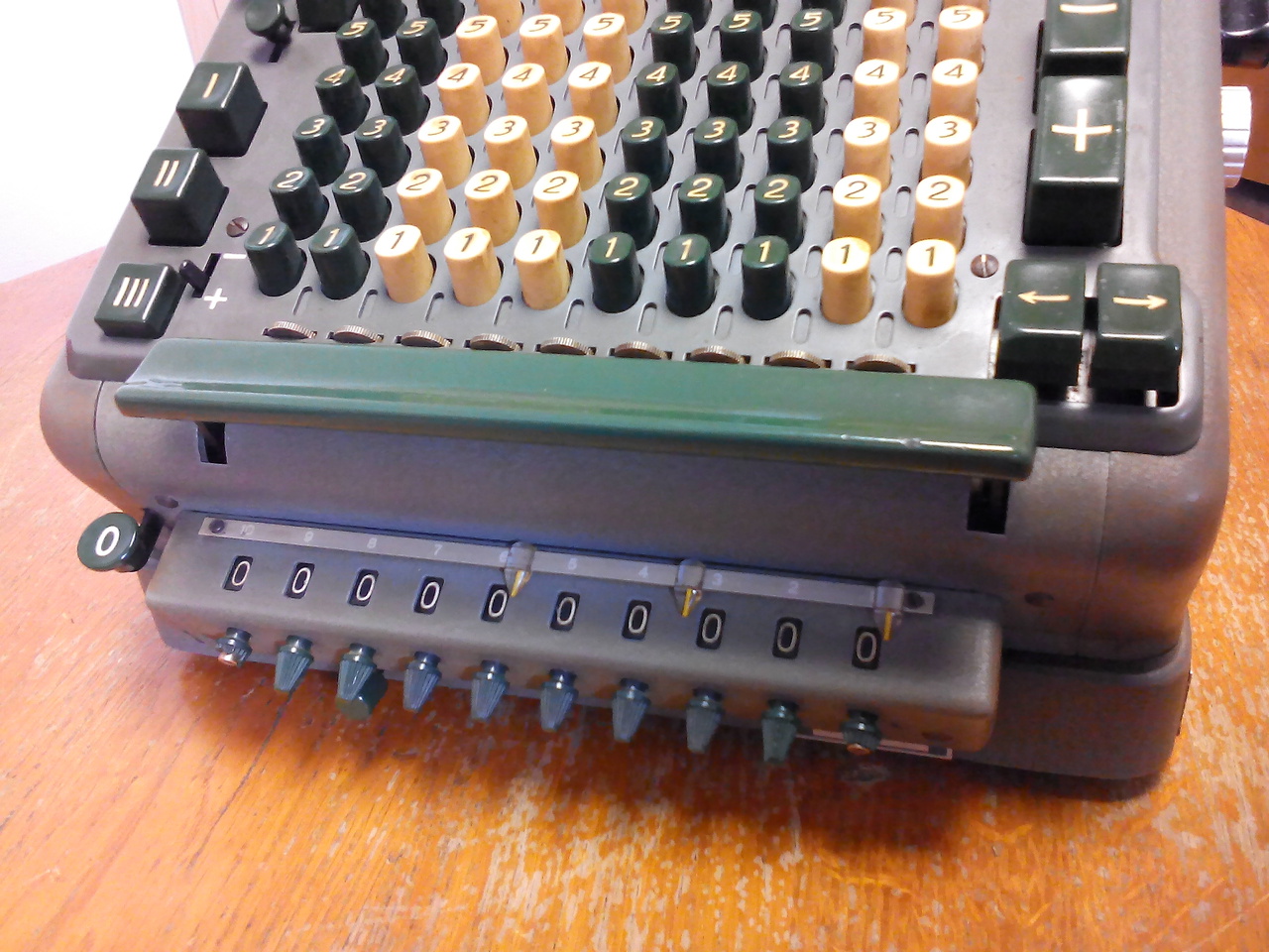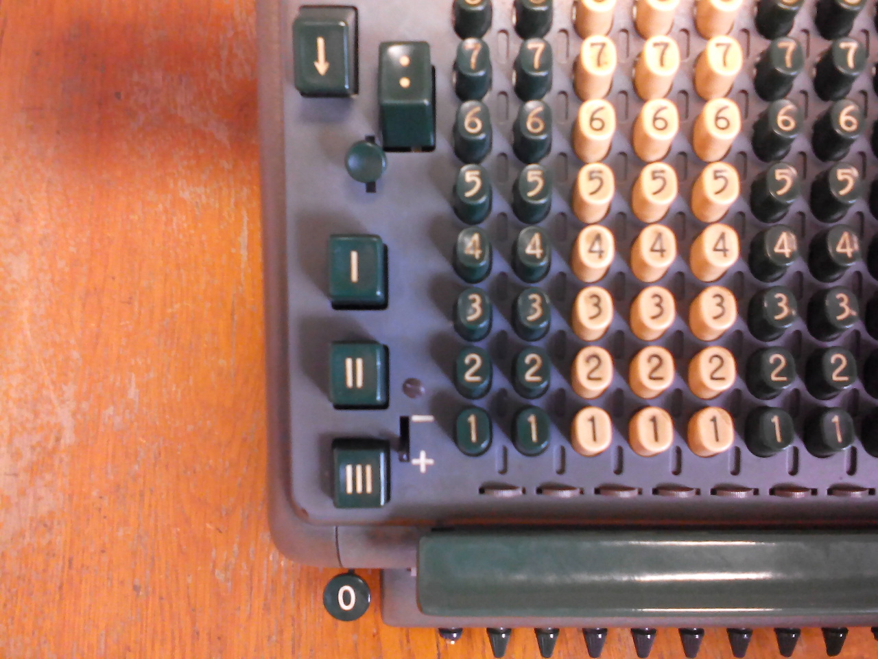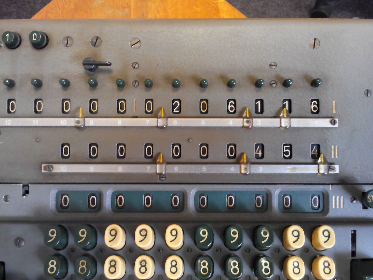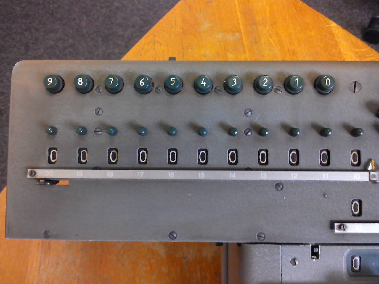 Pod desetimístnými řadami kláves pro zadávání jednotlivých cifer jsou kolečka pro nastavení značek na klávesnici, lišta téměř přes celou šířku klávesnice pro inicializaci násobení nebo pro přenos čísla z klávesnice do registru pro násobení a ovládací prvky pro nezávislé nastavení jednotlivých cifer v registru pro násobení.