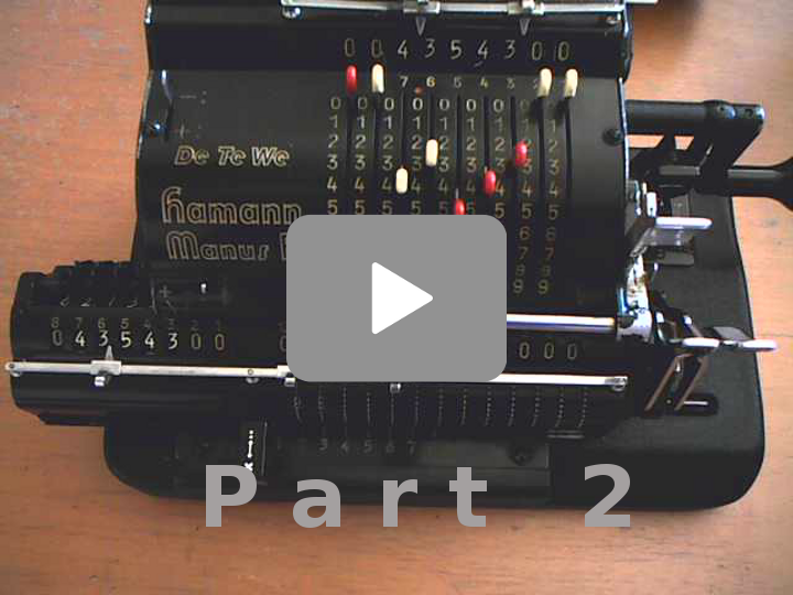 The computations will be demonstrated on the calculator Hamann Manus, model R. This calclator is not pinwheel calculator, but it enjoys the switching latch-wheel technology. As a big advantage, this calculator allows automatic division! See some comments concerning this calculator.